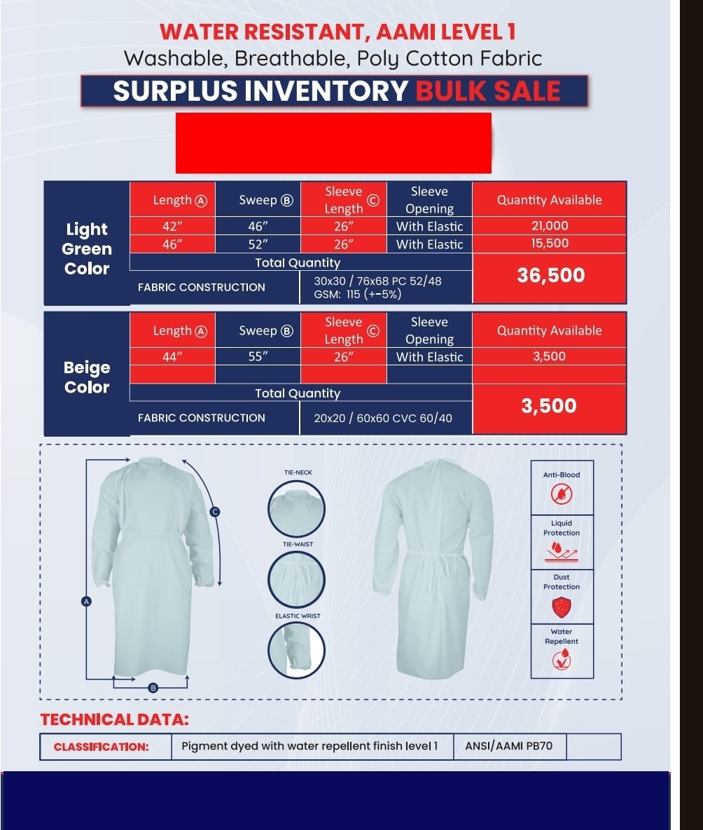 These AAMI Level 1 isolation gowns are part of our surplus inventory, and we're offering them at a significantly reduced price. Take advantage of this limited-time offer to get high-quality gowns at unbeatable rates. Call now before stock runs out!